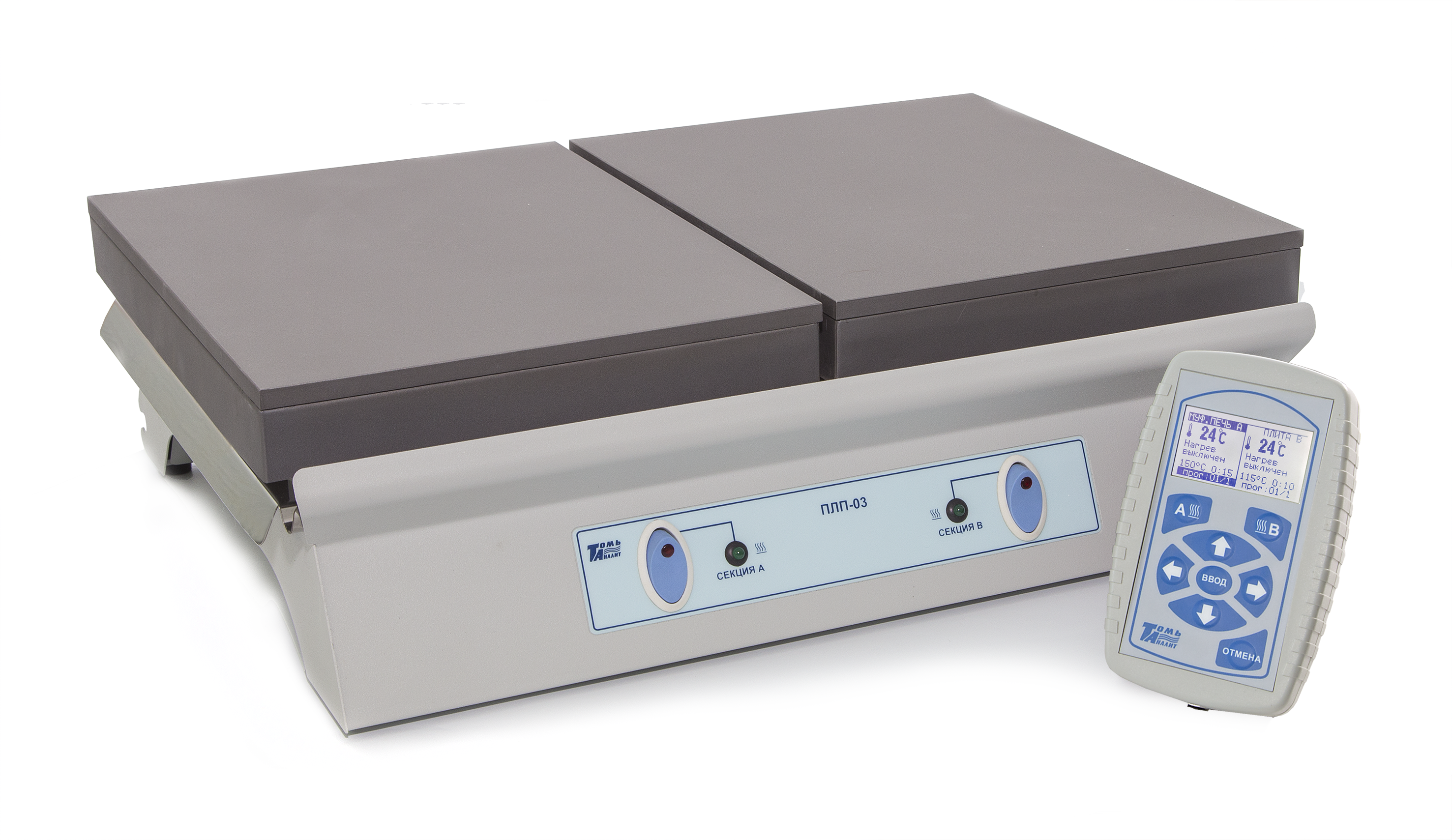 Плита нагревательная лабораторная программируемая ПЛП-03 имеет две секции нагрева. Каждая секция нагрева может работать отдельно или совместно. Температура нагрева секций и время поддержания температуры нагрева задаются оператором.